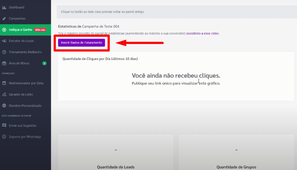 Importante: Em ambos os módulos "Campanhas de WhatsApp" e "Redirecionador por clique" é preciso ENTRAR na aba "Estatísticas da campanha" para que os dados e gráficos sejam atualizados todos os dias.