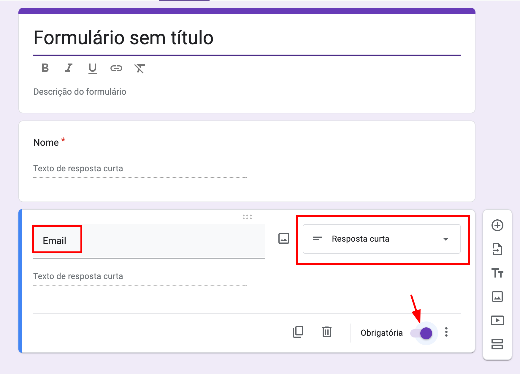 2º Campo: **Email**, tipo de resposta: **Resposta Curta**, **obrigatório**;