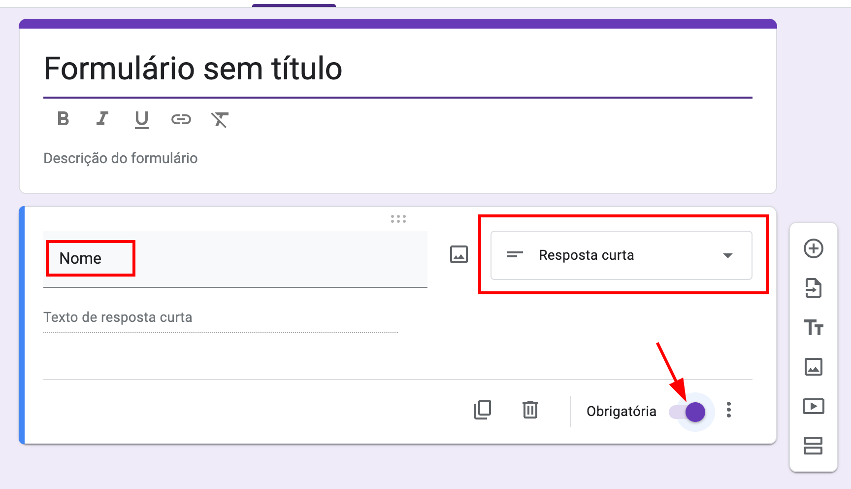 1º Campo: **Nome**, tipo de resposta: **Resposta Curta**, **obrigatório**;