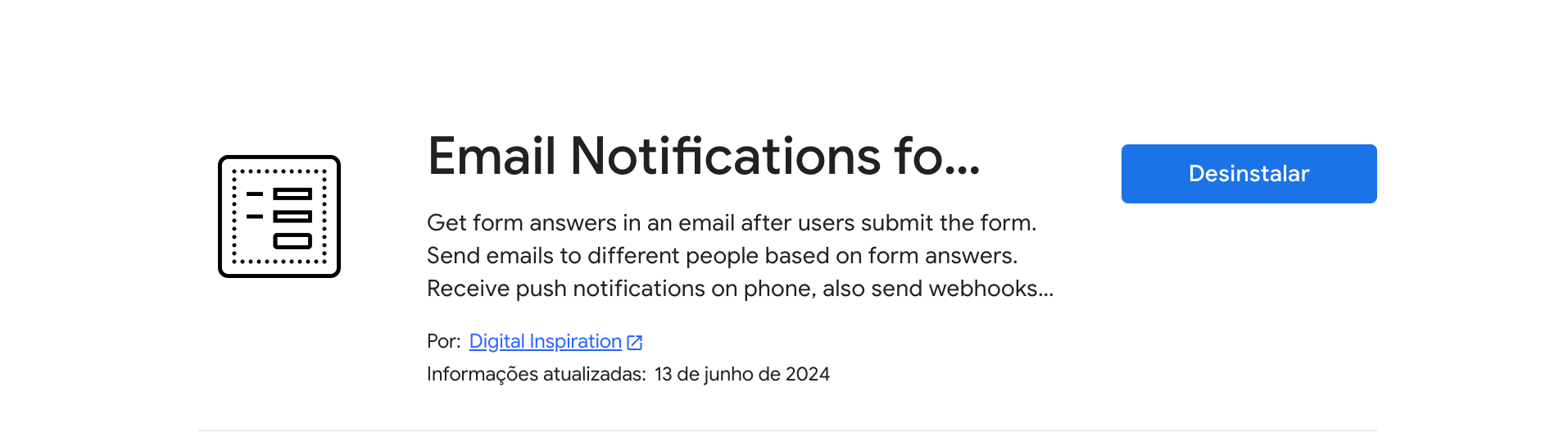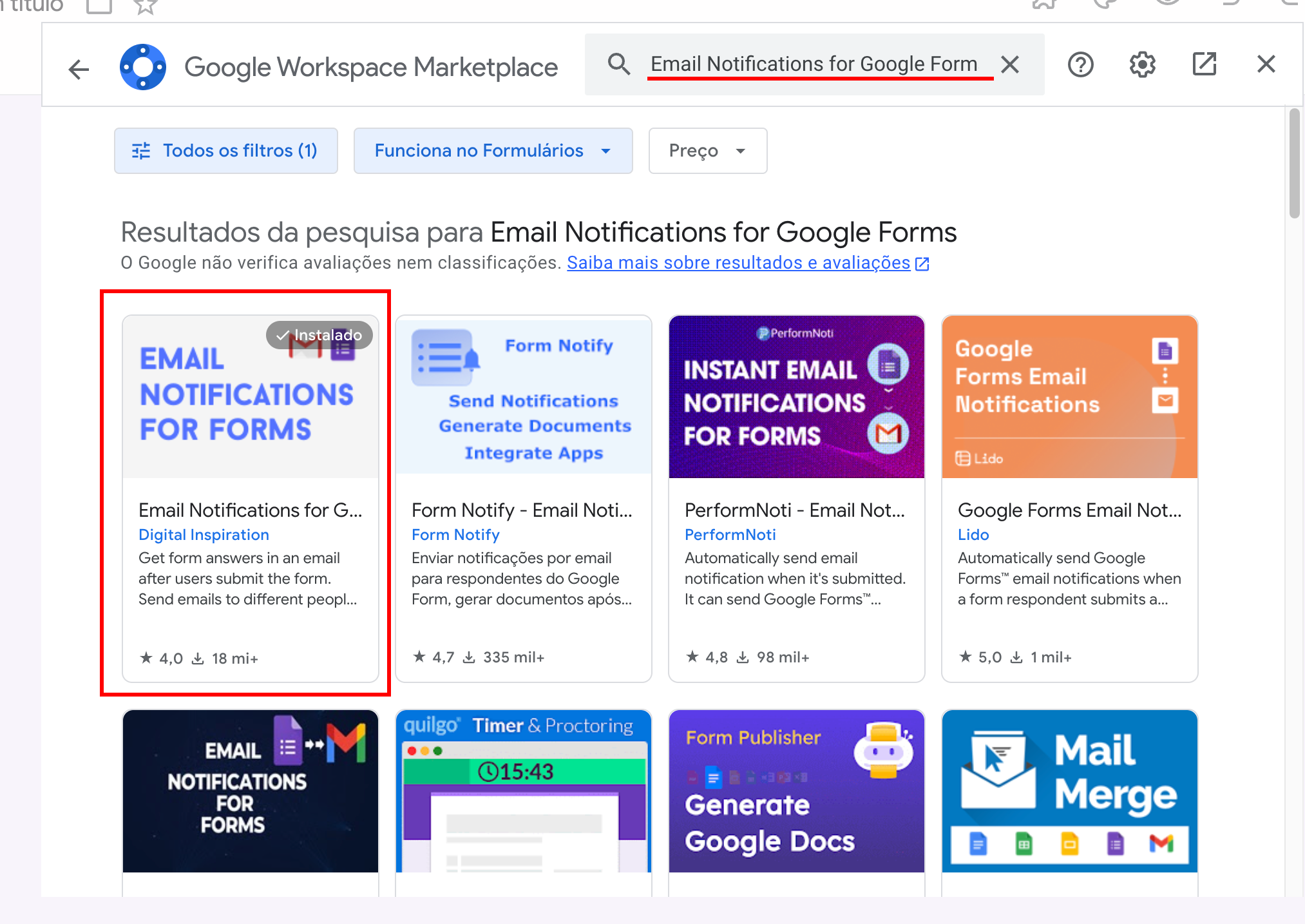 Na tela seguinte pesquise por **Email Notifications For Google Forms** e selecione a opção destacada na imagem a seguir: