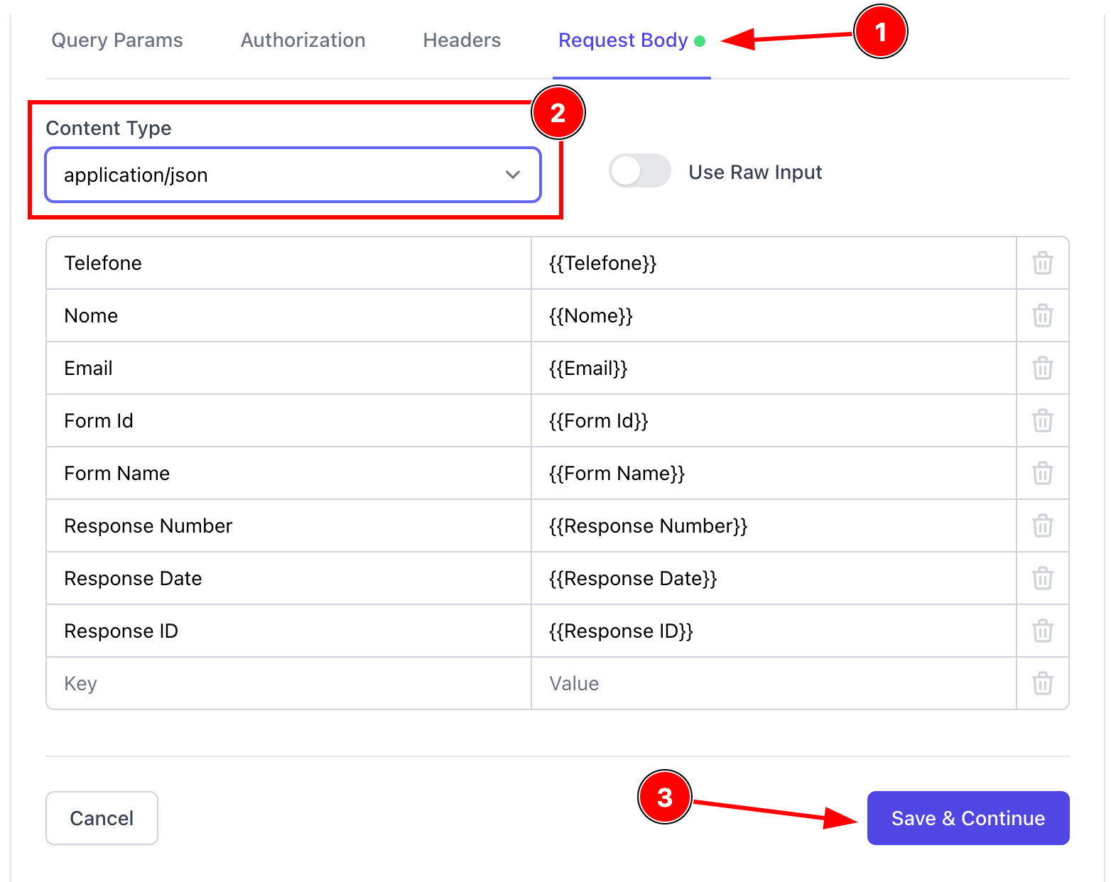 Em seguida, selecione a guia **Resquest Body (1),** e na **opção Content Type, selecione application/json (2),** por fim, clique em **Salvar e Continuar (3):**