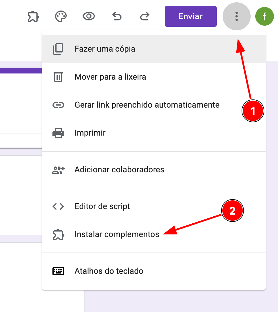 Na seu formulário no Google Forms, acesso o **menu de opções (1)** e em seguida clique em **Instalar Complementos (2)**.