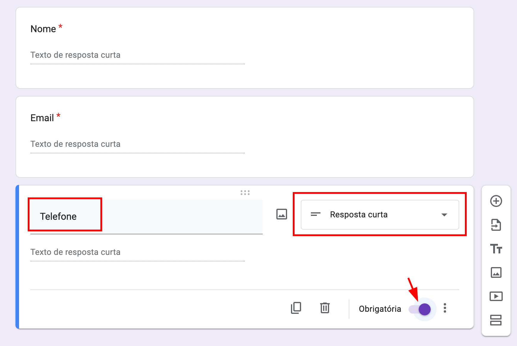 3º Campo: **Telefone**, tipo de resposta: **Resposta Curta**, **obrigatório**;