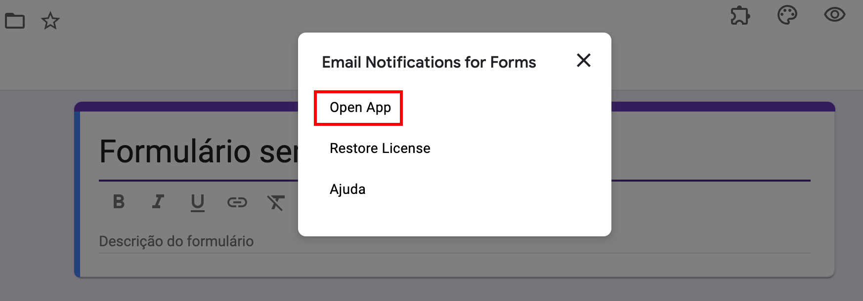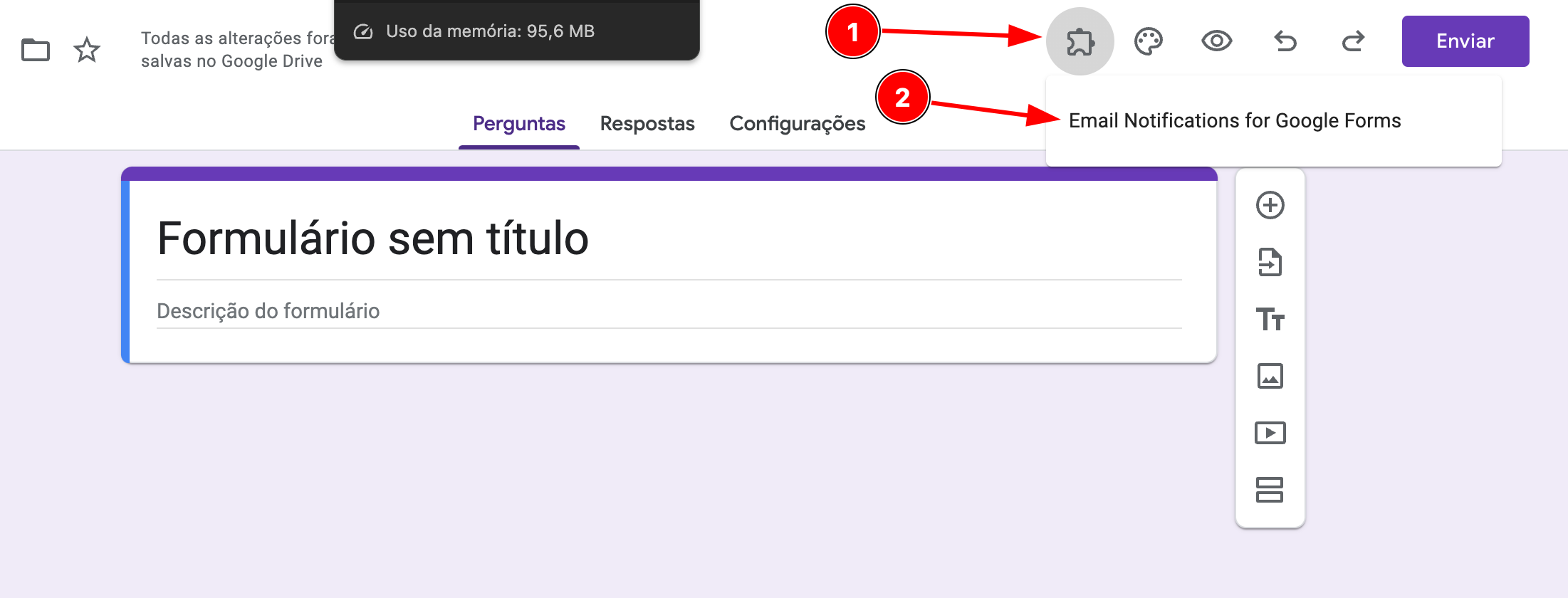 De volta ao formulário, clique na opção de **Complementos** e selecione a extensão que foi instalada no passo anterior: